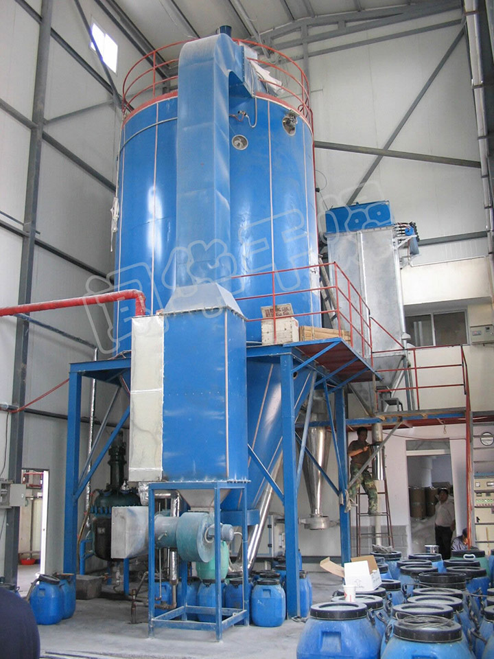 離心噴霧干燥機工作原理:空氣經(jīng)過濾和加熱,進入干燥器頂部空氣分配器,熱空氣呈螺旋狀均勻地進入干燥室。料液經(jīng)塔體頂部的高速離心霧化器,(旋轉(zhuǎn))噴霧成細微的霧狀液珠,與熱空氣并流接觸在短時間內(nèi)可干燥為成品。成品連續(xù)地由干燥塔底部和旋風(fēng)分離器中輸出,廢氣由風(fēng)機排空。